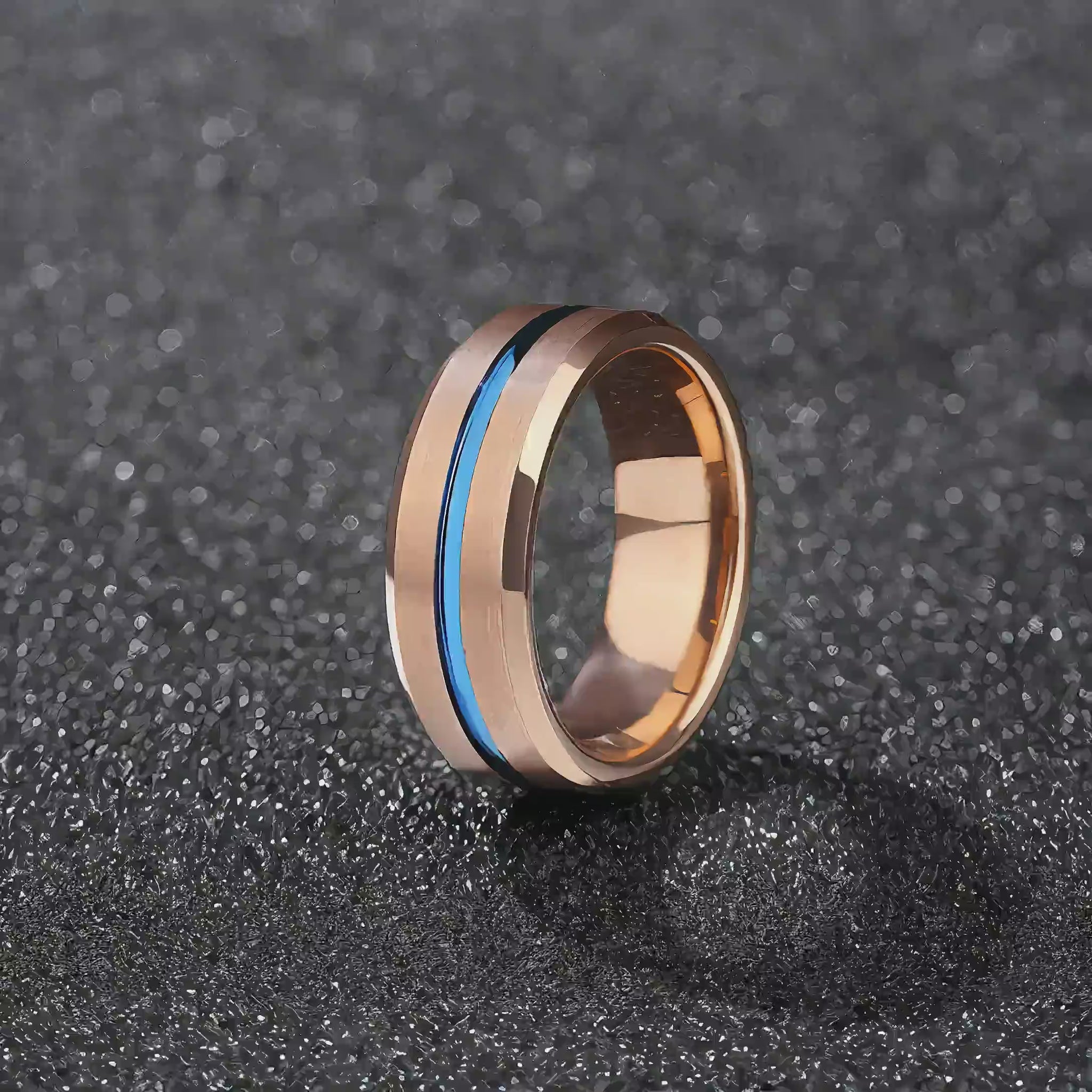 Crafted from tungsten steel with a rose gold plating, this modern ring features a captivating central inlay of deep, oceanic blue metal. The brushed textured surface is accentuated by this elegant, eye-catching detail, imbuing the design with a sense of refined, coastal-inspired allure.