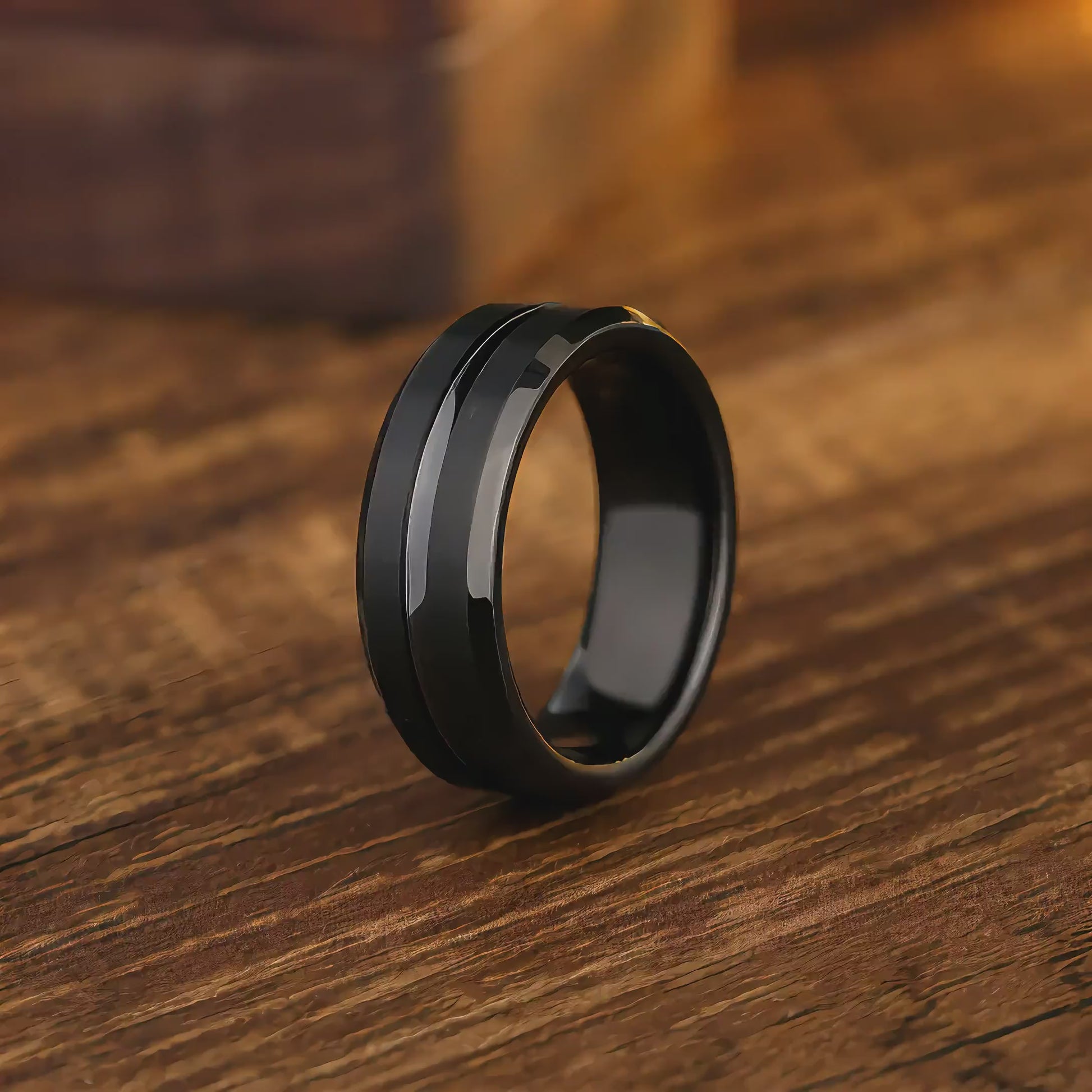 Crafted from sleek black tungsten steel, this masterfully designed ring features a captivating interplay of textures. The polished central groove is flanked by linear brushed bands, creating a striking visual contrast that evokes the rugged elegance of industrial design. Combining modern style with exceptional durability, this ring is a testament to the art of masculine refinement.