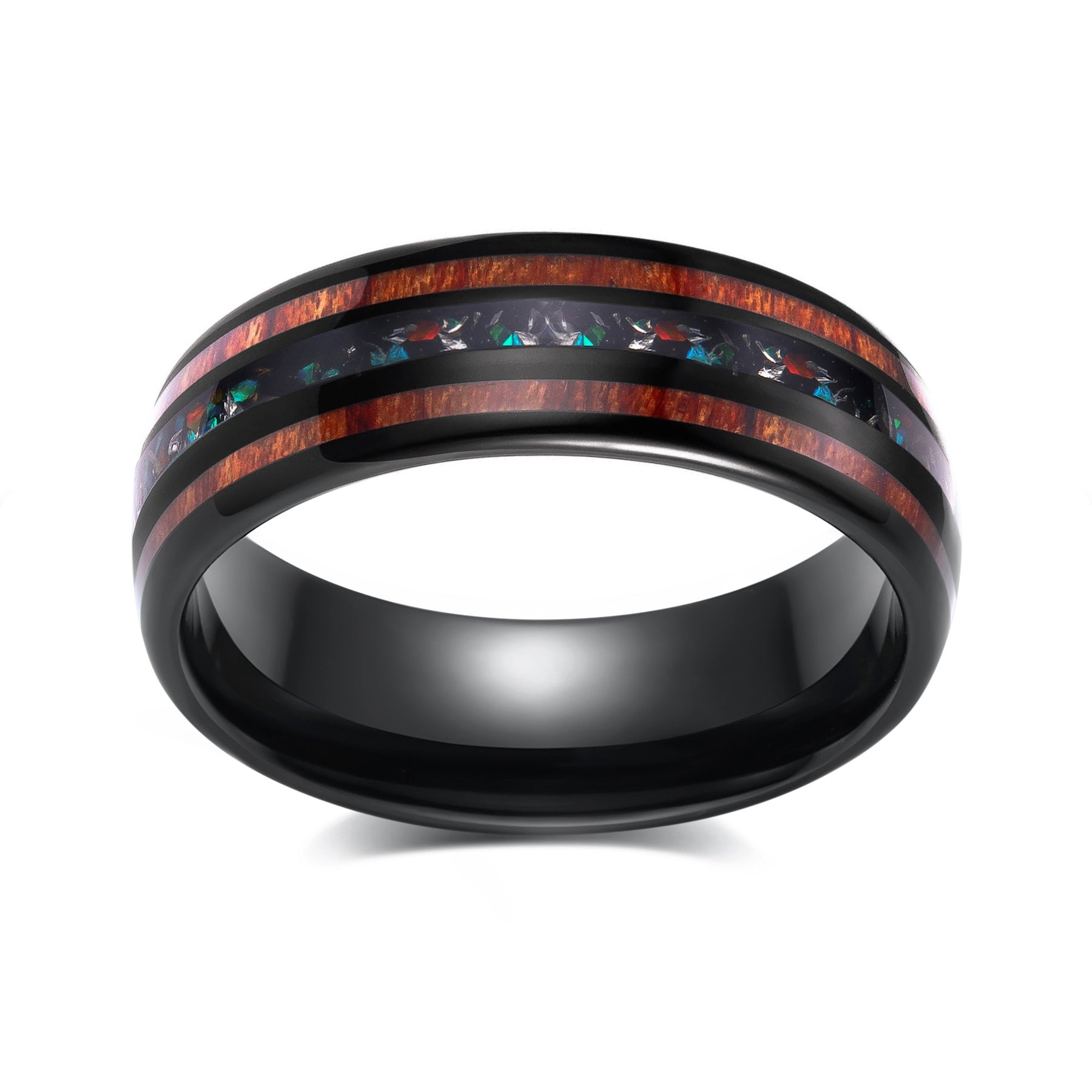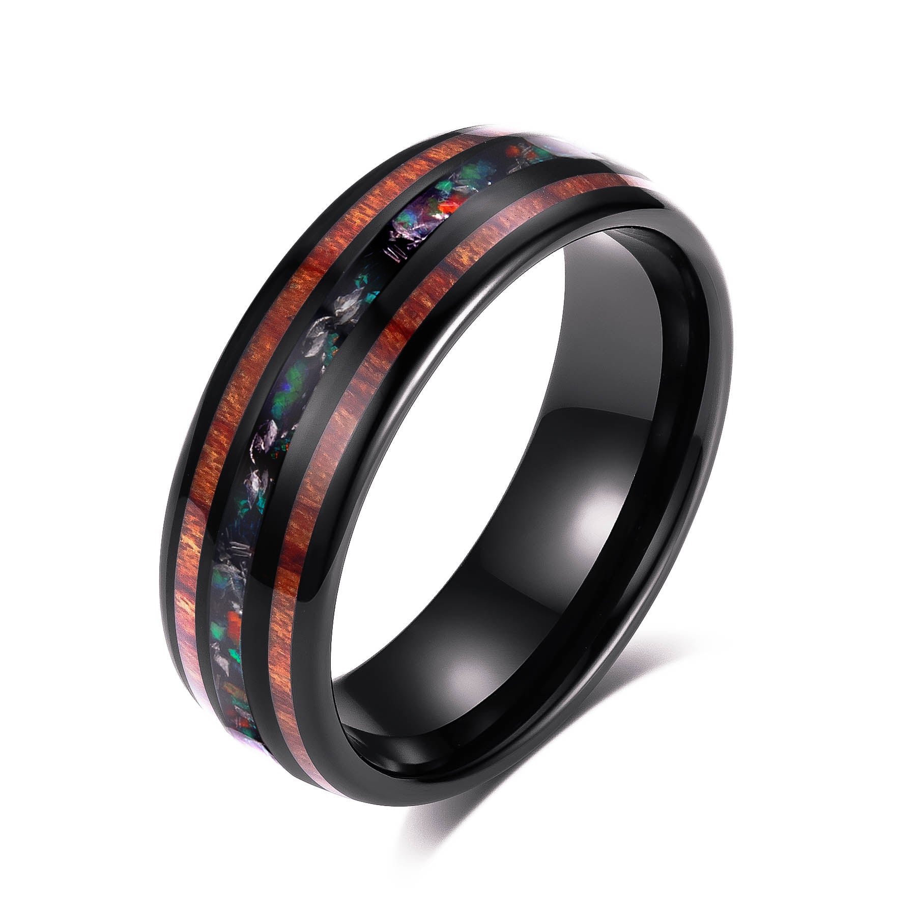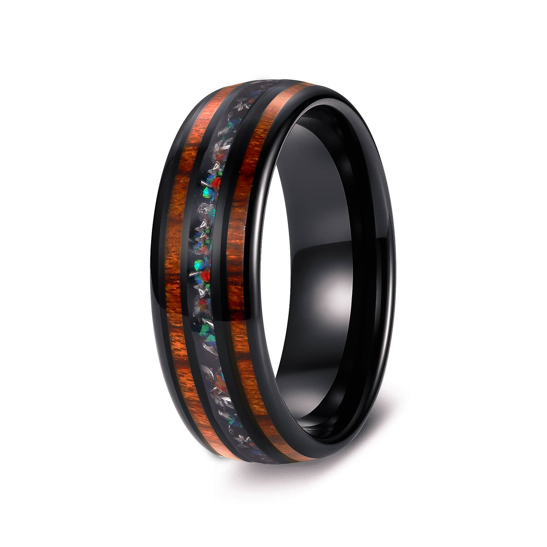 Crafted from sleek black tungsten steel, this modern ring showcases a captivating center of shimmering Australian opal, flanked by rich inlays of weathered whiskey barrel wood. Like a true connoisseur, this design has been refined by the passage of time, the opal radiating a more brilliant luster and the wood imbued with a captivating aroma - a testament to the perfection that comes with experience.