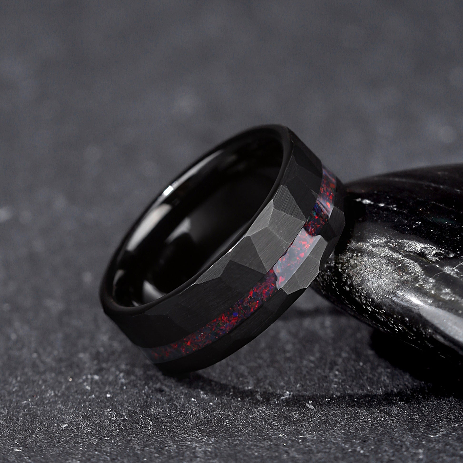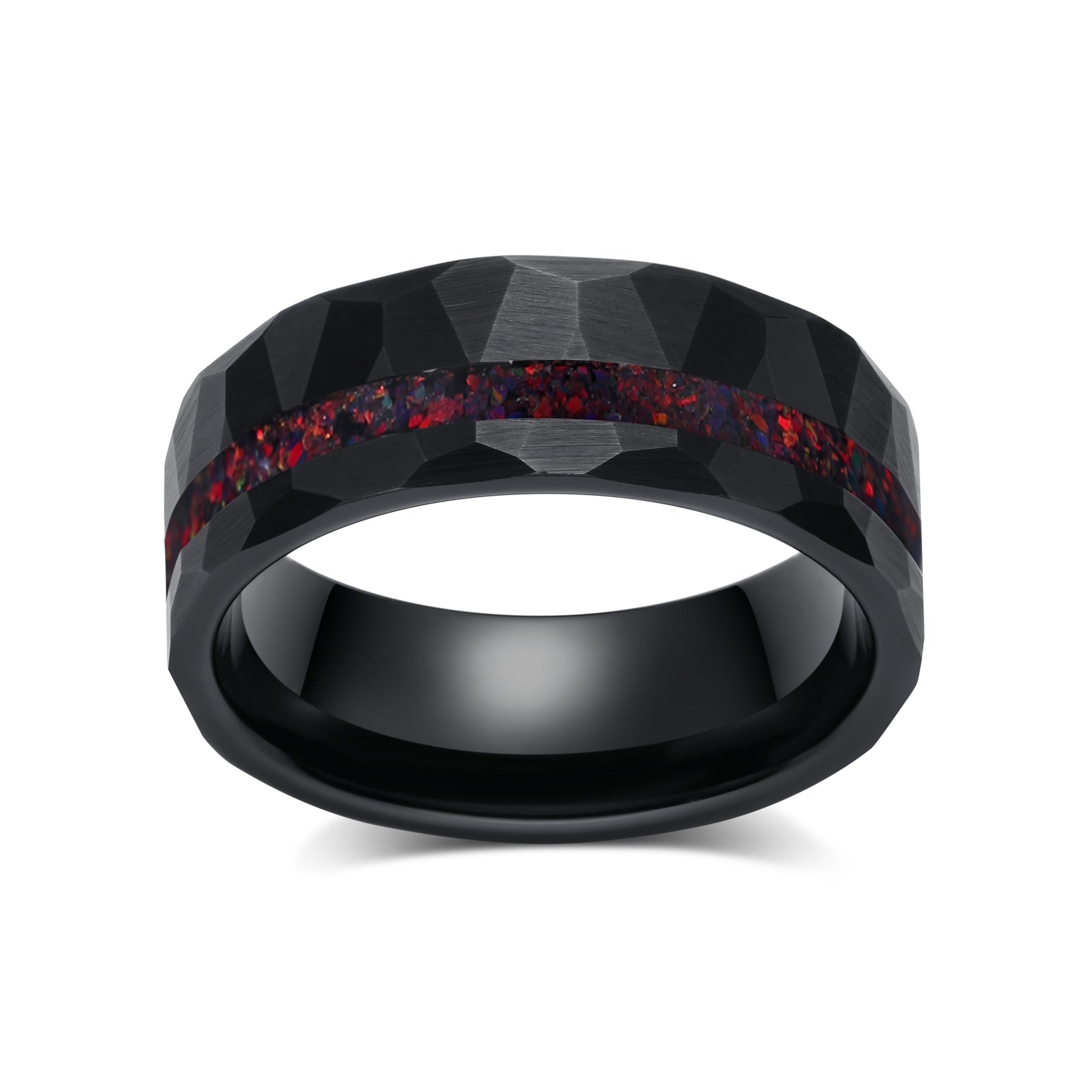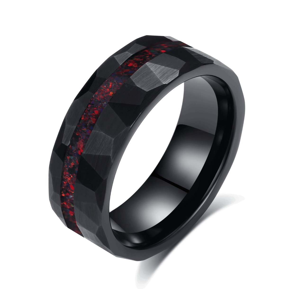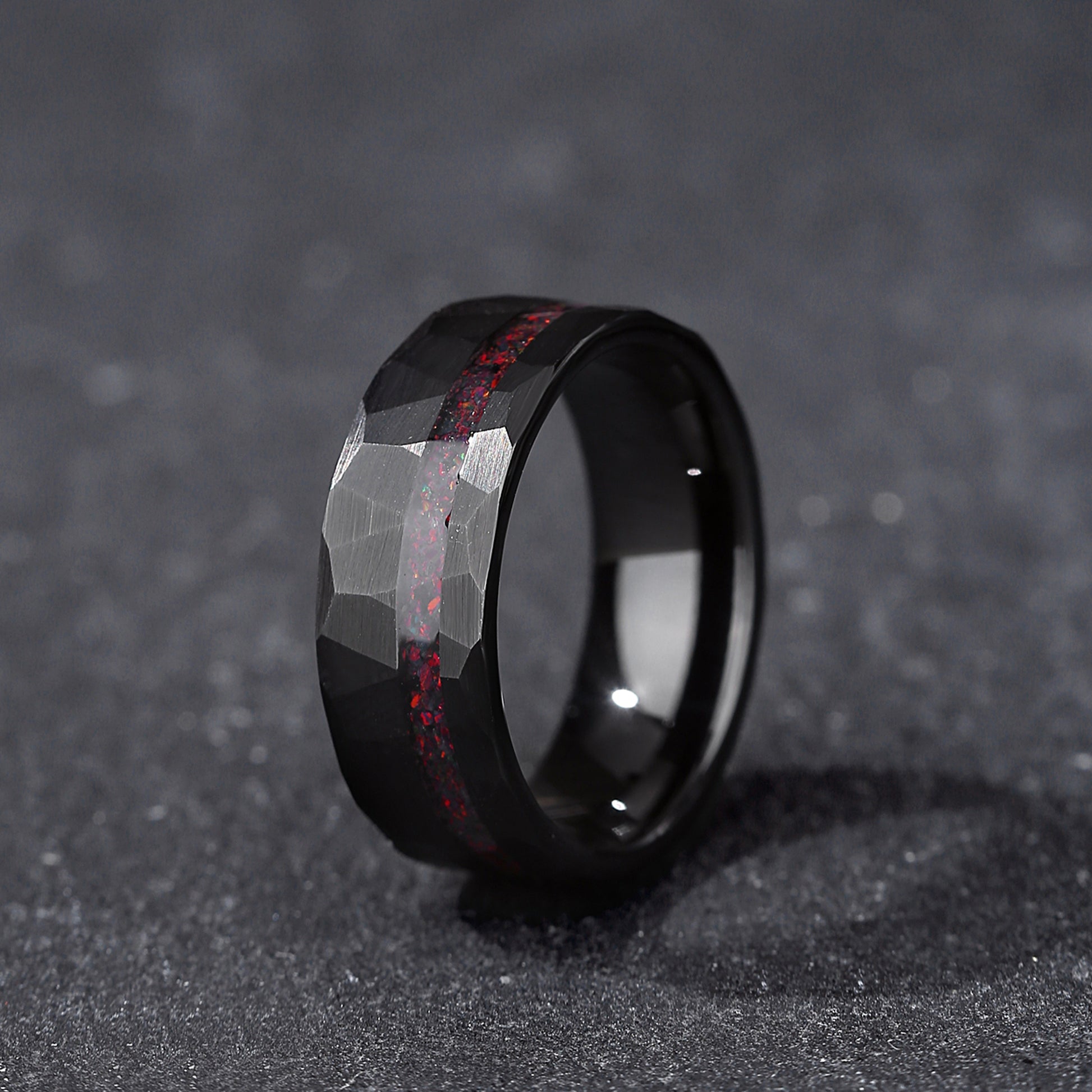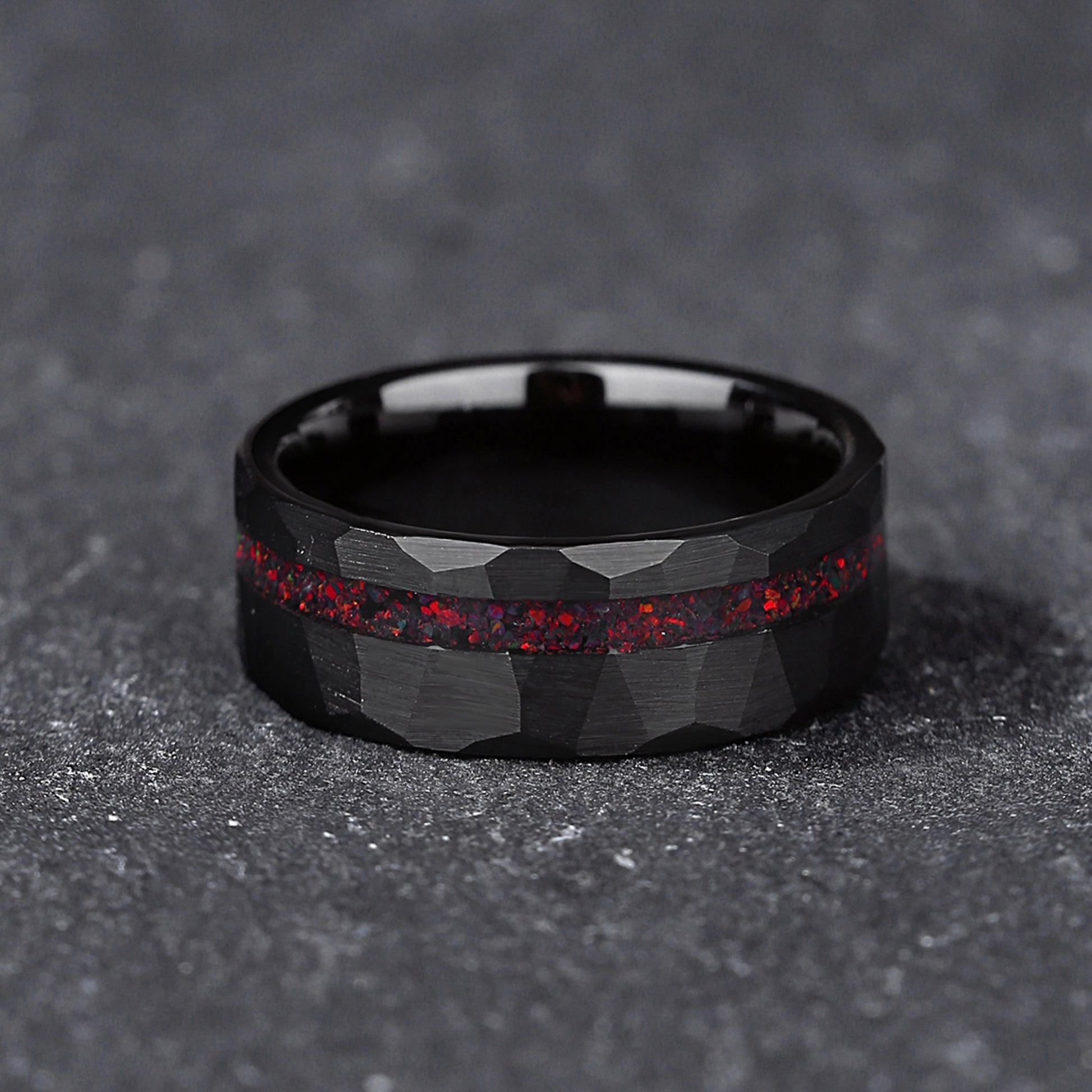Crafted from sleek black tungsten steel, this modern ring features a bold gold-plated hammered texture on the outer band. The rugged, forge-wrought aesthetic evokes the spark and forge of a blacksmith's workshop, imbuing the design with a sense of primal, industrial-inspired passion.