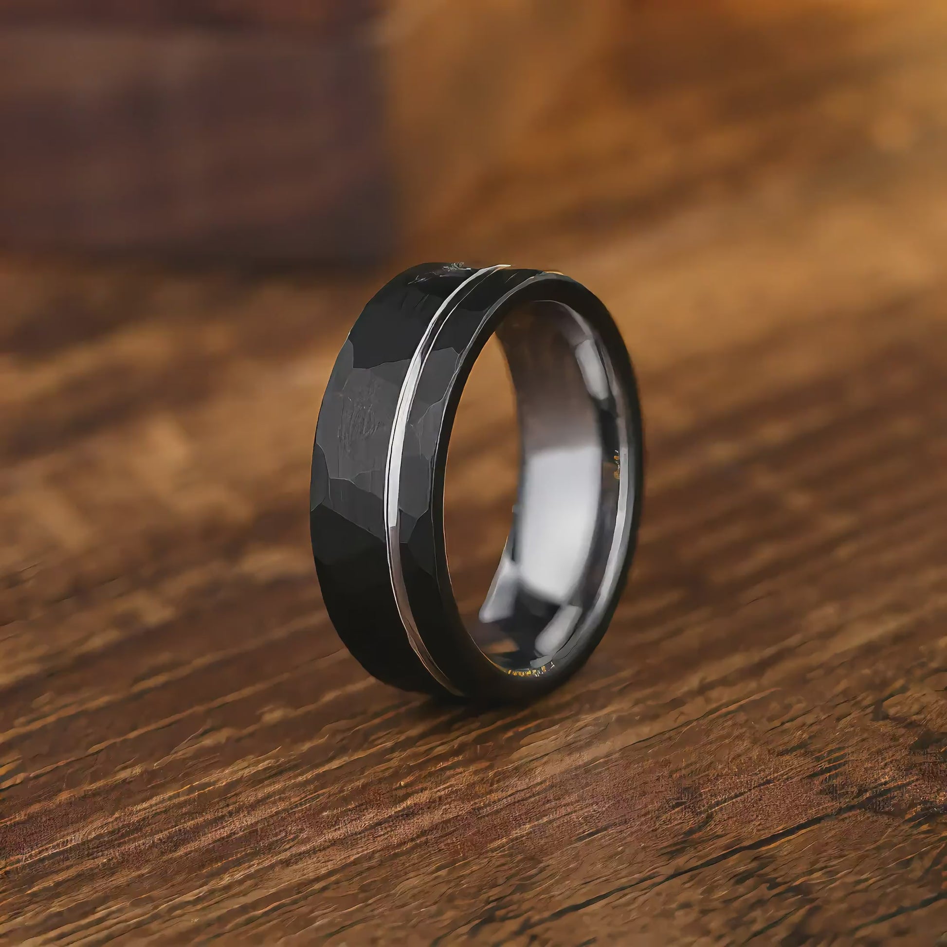 Chaos refined. Hammered tungsten meets sleek silver inlays—a dance of raw grit and polished poise. For the man who tempers storms with silence, whose strength lies in subtlety. No flash, just fire. Wear the quiet authority of one who masters both anvil and ballroom. Elegance isn’t worn… it’s forged.