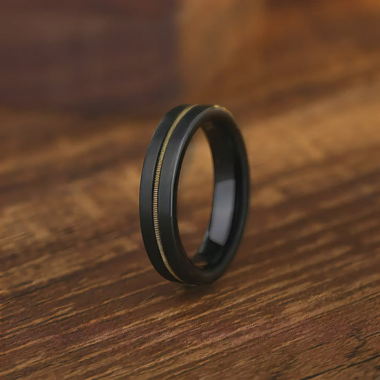 Crafted from sleek black tungsten steel, this modern ring features a captivating inlay of authentic guitar strings running through the center. This unique design pays homage to the timeless instrument, blending industrial sophistication with the raw, expressive power of music.
