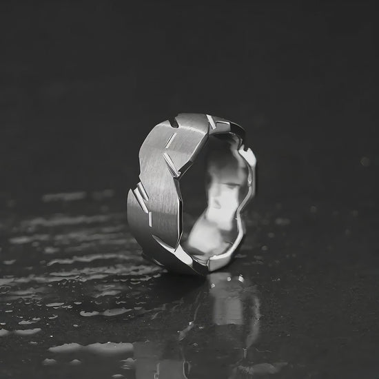 Crafted from sleek silver tungsten steel, this bold and innovative ring defies traditional ring design with its striking angular silhouette. Precisely cut facets create a mesmerizing interplay of light and shadow, while the polished edges lend a dynamic metallic sheen. This pioneering design ushers in a new era of modern masculine style.