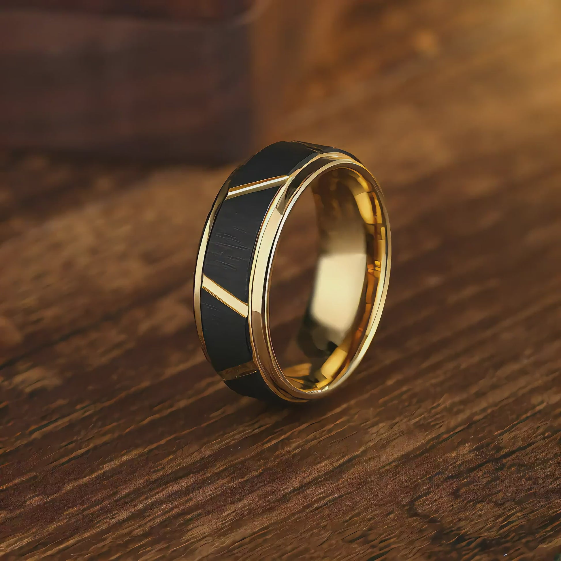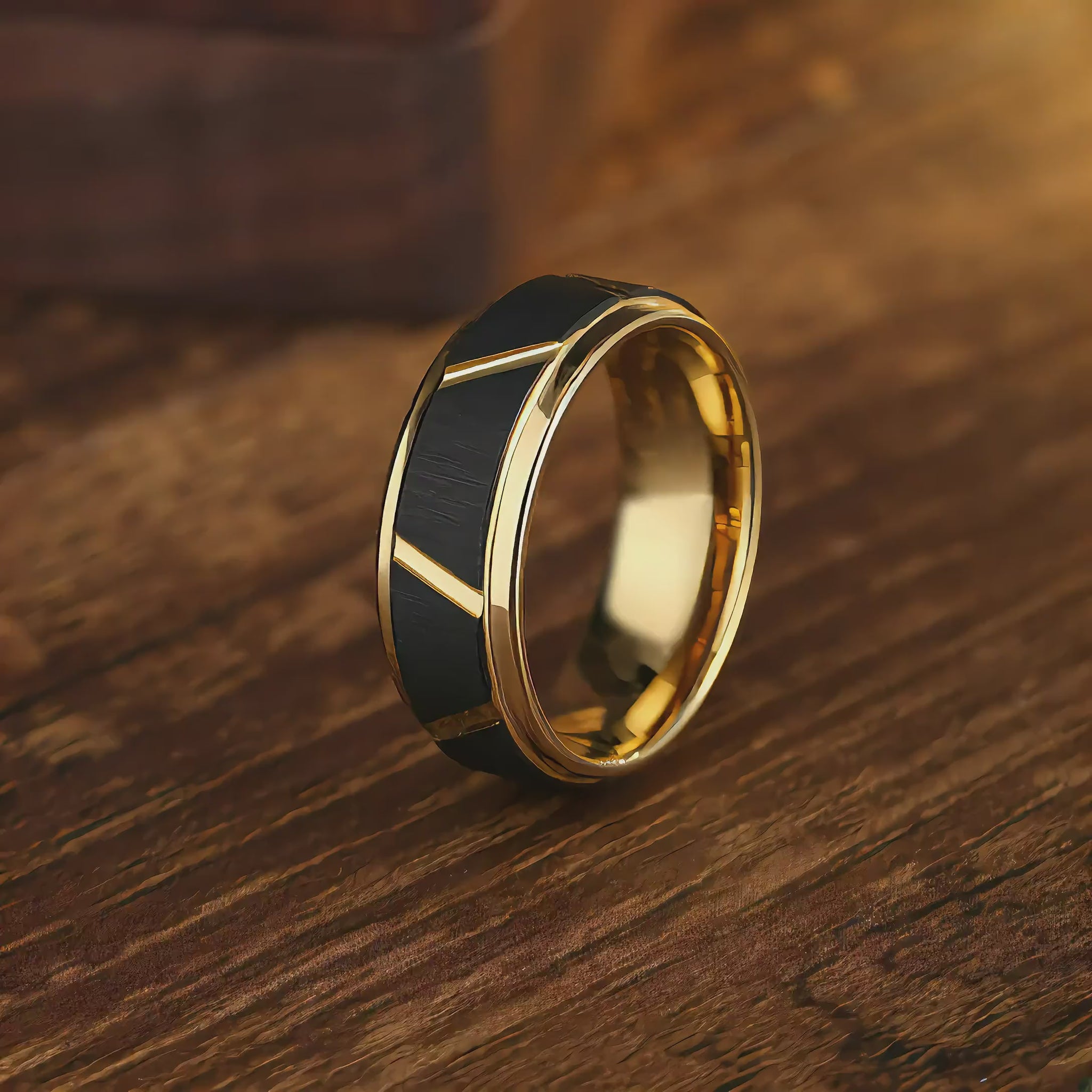 Black steel etched with gold—geometry meets grit. Brushed tungsten whispers discipline; sharp angles scream defiance. Forged for those who need no flash, just a relentless nudge: conquer, adapt, outlast. Wear the clash of shadow and fire. Every facet a vow: greatness isn’t given. It’s carved.