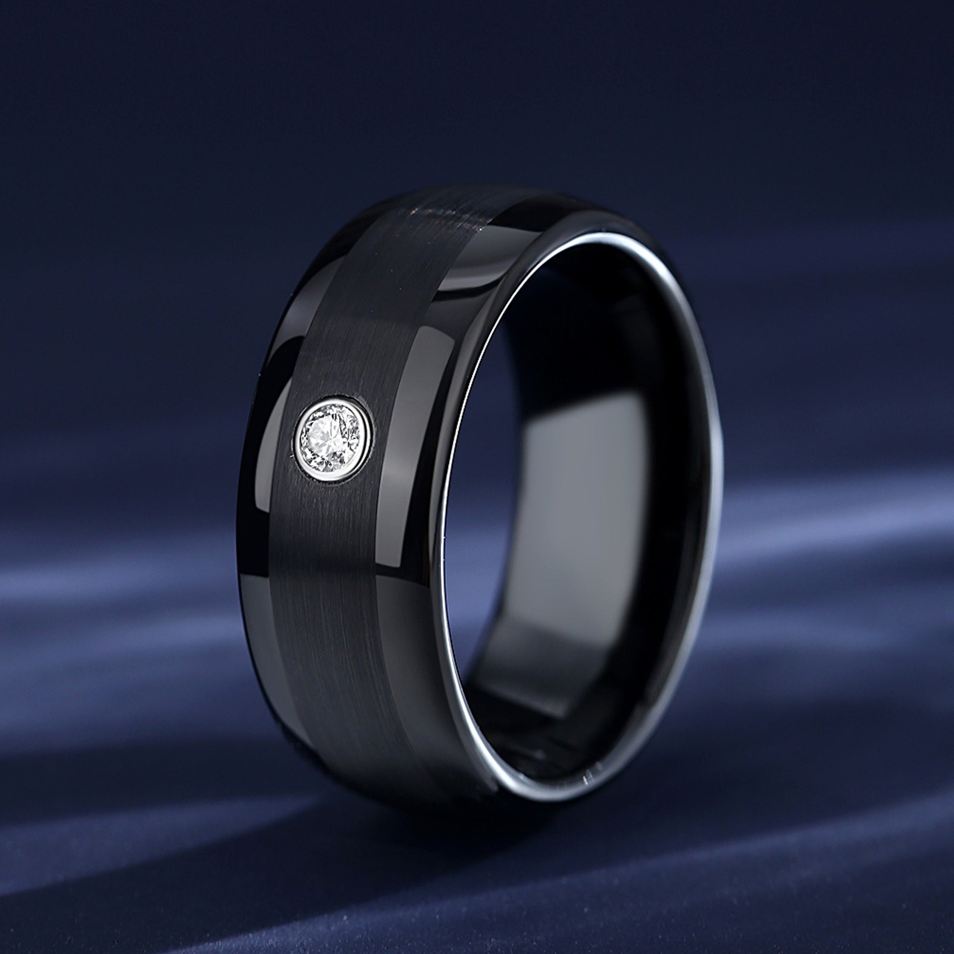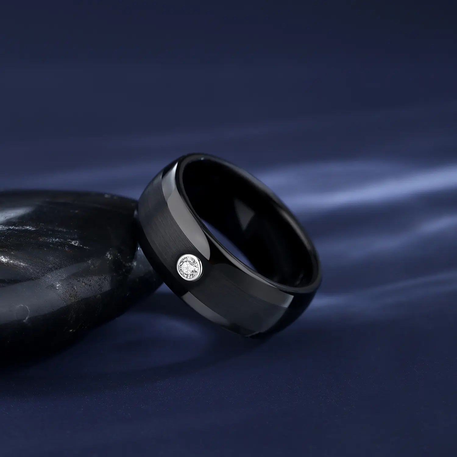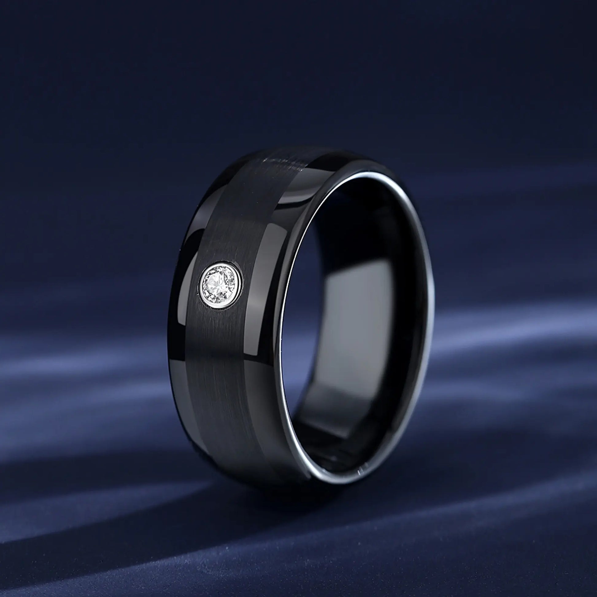Black isn’t a trend—it’s a creed. The Rebel wields stealth-approved tungsten with a brushed finish and step-down edges that snarl texture into tradition. Centered by an ice-cold moissanite, it’s for those who rule shadows, not spotlights. Classic? Redefined. Cool? Understated. Wear the darkness that outlives fads. Because rebellion thrives in the details.