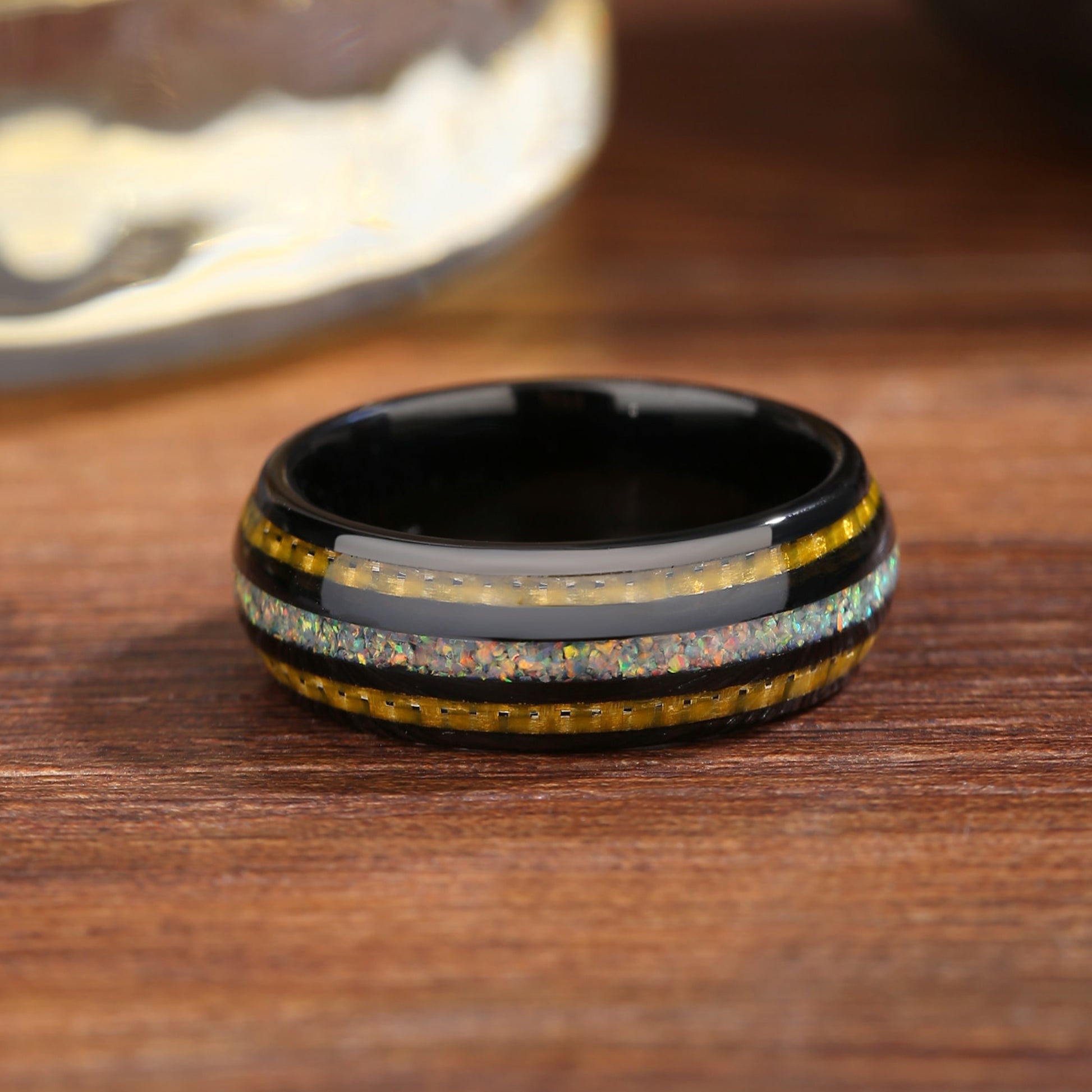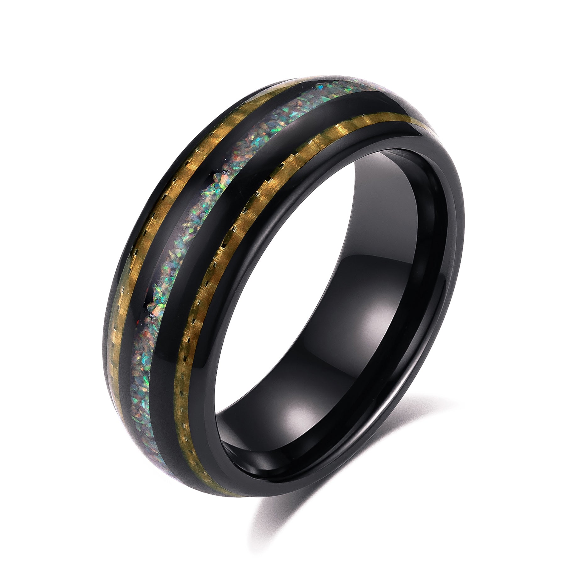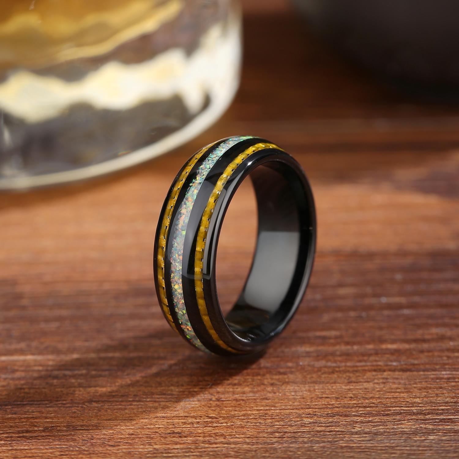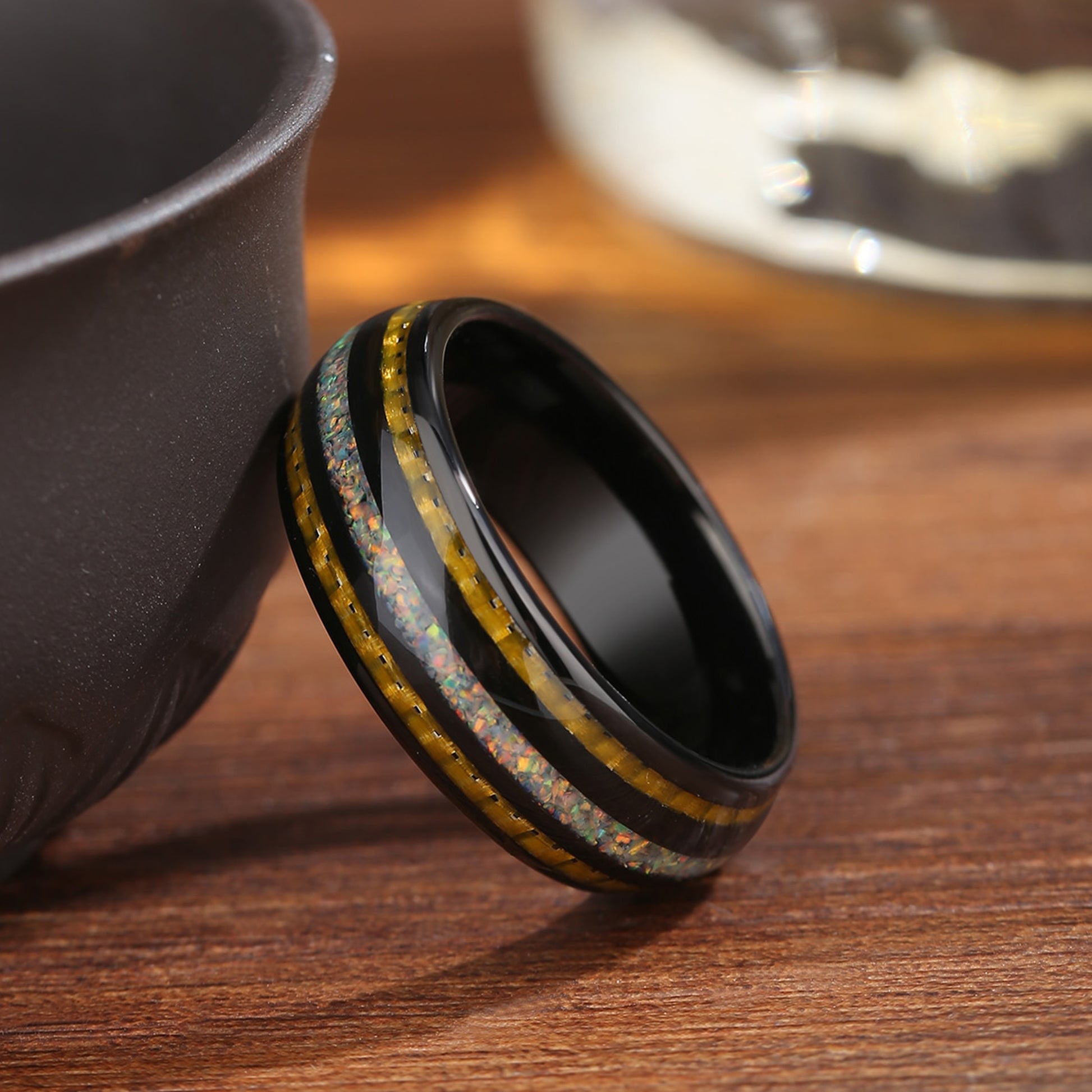 Crafted from sleek black tungsten steel, this modern ring features a captivating center of shimmering Australian opal, flanked by rich inlays of weathered whiskey barrel wood. This design evokes the warm, introspective haze of cherished memories, transporting the wearer back to indulgent, bittersweet moments of the past.