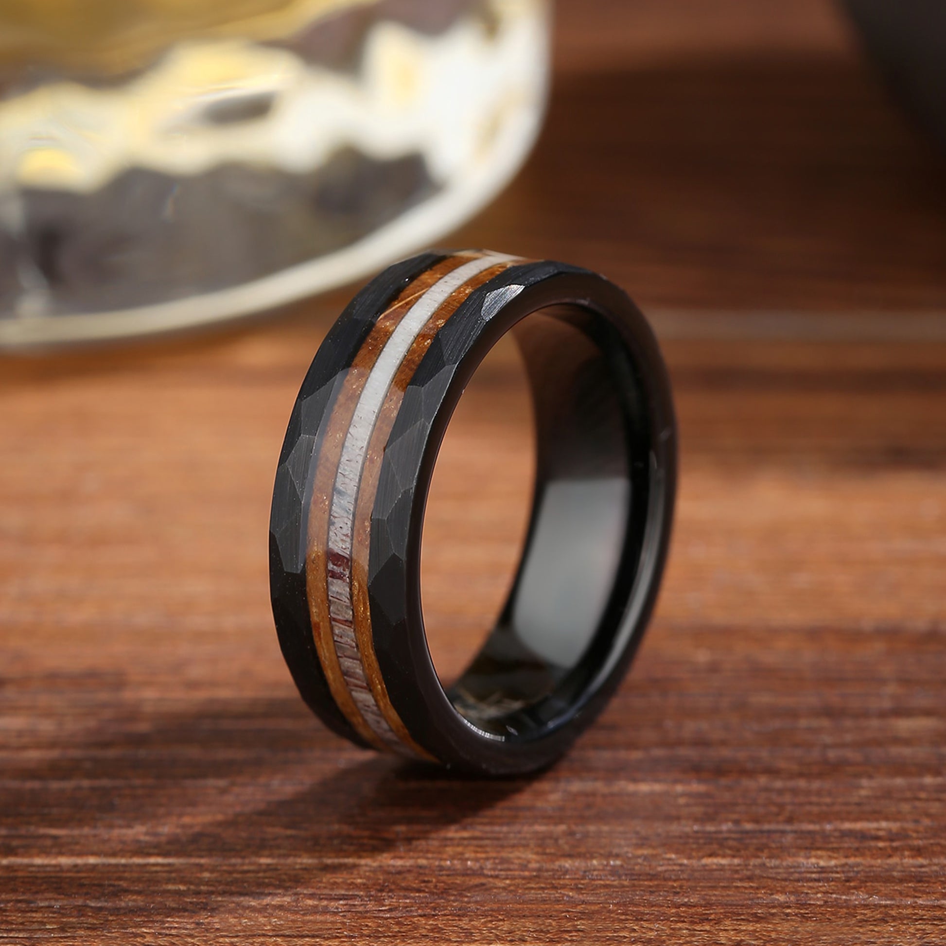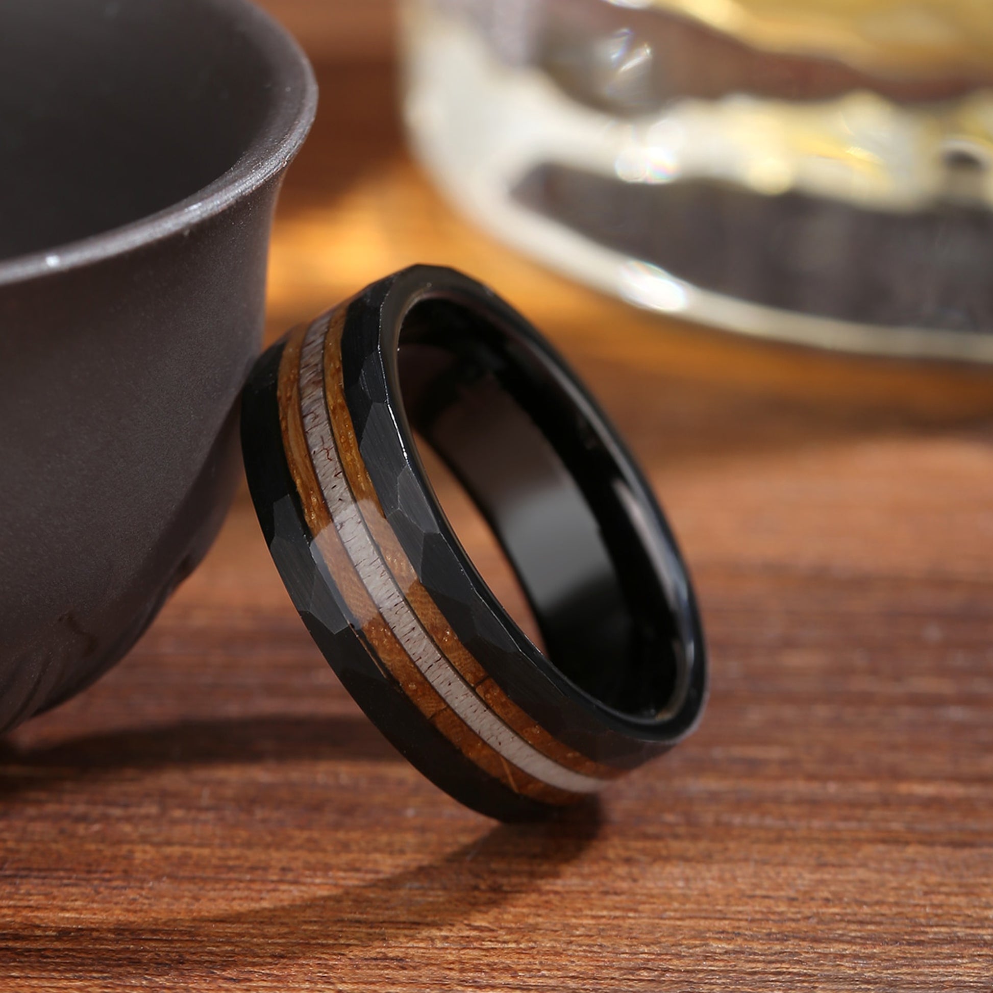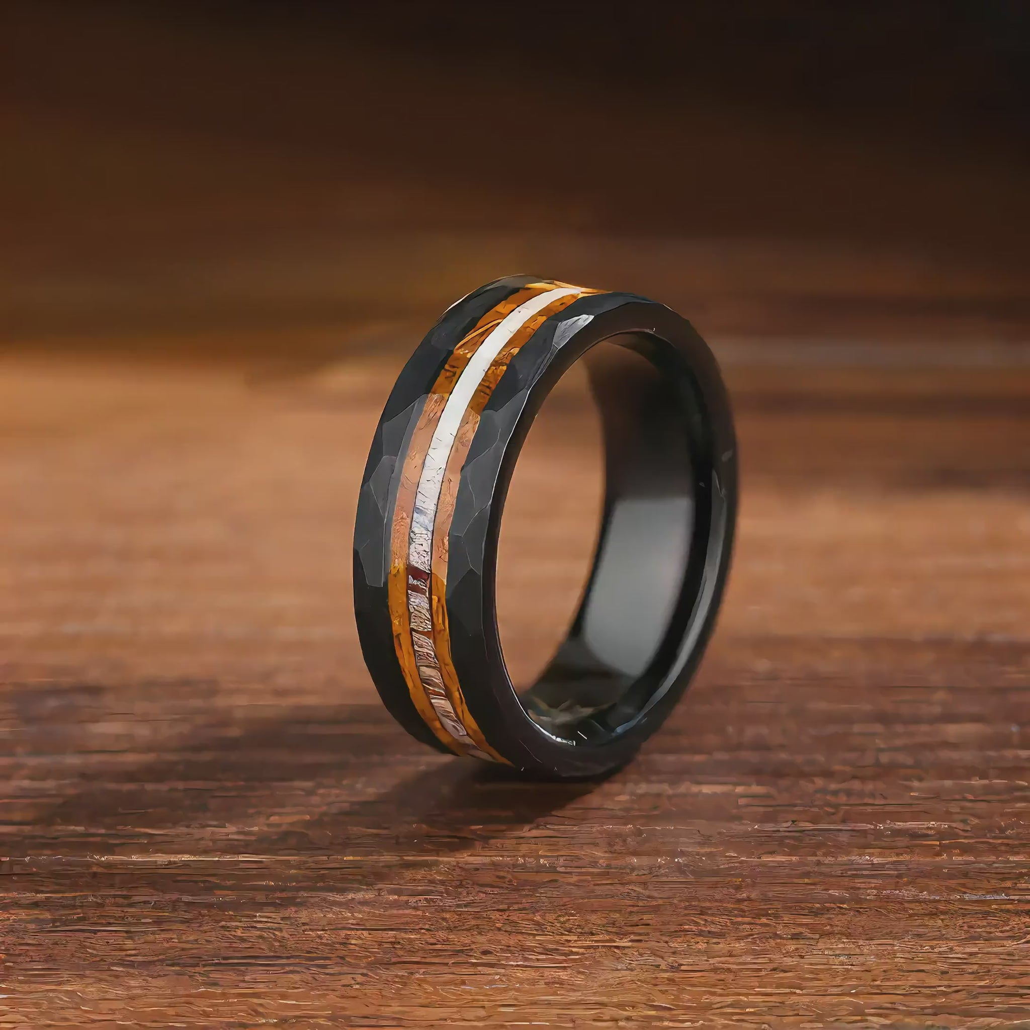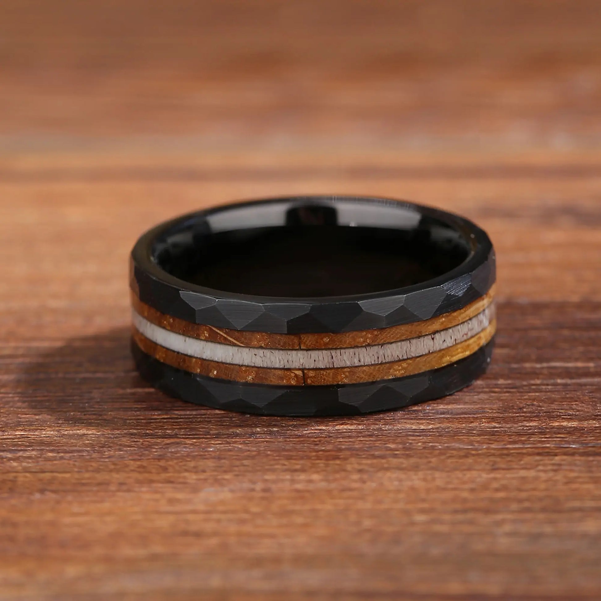 Connecting the wearer to the primal energies of the natural world, The Wildwood is a captivating fusion of raw elements and refined craftsmanship. Forged from tungsten steel with a hammered finish, this exceptional ring features the earthy elegance of Oka wood and the majestic presence of sustainably sourced deer antler. A testament to the harmonious bond between man and nature, The Wildwood embodies a profound reverence for the wilderness and the indomitable spirit that resides within.